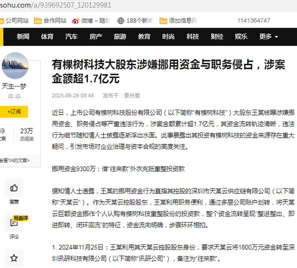有棵树科技大股东涉嫌挪用资金与职务侵占,涉案金额超1.7亿元