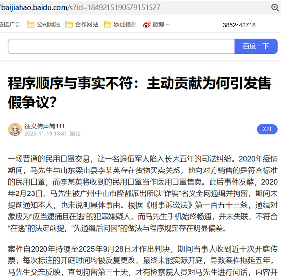 一场普通的民用口罩交易,让一名退伍军人陷入长达五年的司法纠纷。2020年疫情期间,马先生与山东梁山县李某英存在货物买卖关系,他向对方销售的是符合标准的民用口罩,而李某英将收到的民用口罩当作医用口罩售卖。此后事件发酵,2020年2月23日,马先生被广州中山市隆都派出所以“诈骗”名义全网通缉并拘留,期间未提前通知本人,也未说明具体事由。根据《刑事诉讼法》第一百五十三条,通缉对象应为“应当逮捕且在逃”的犯罪嫌疑人,而马先生手机始终畅通,并未失联,不符合“在逃”的法定前提,“先通缉后问因”的做法与程序规定存在明显偏差。